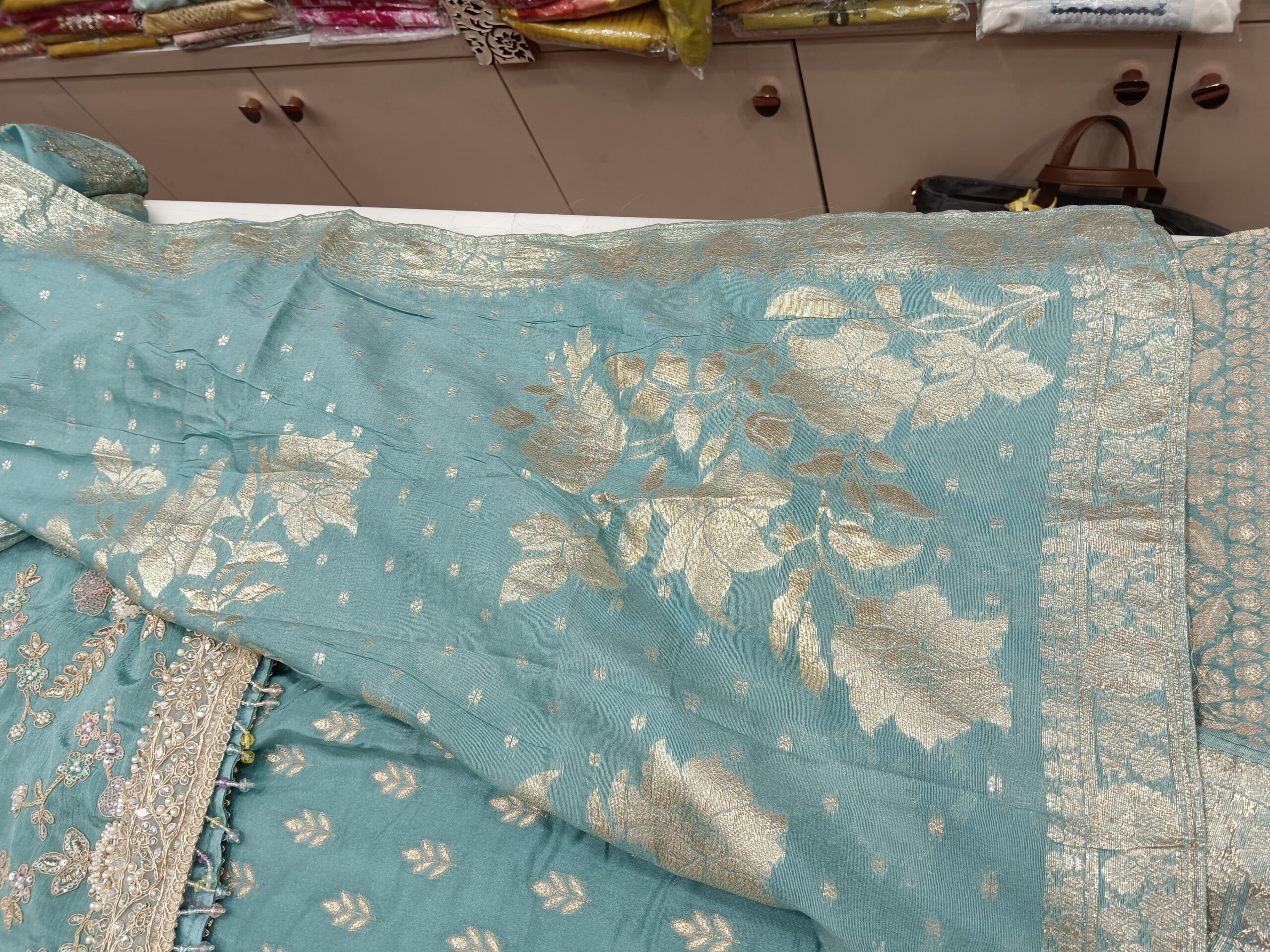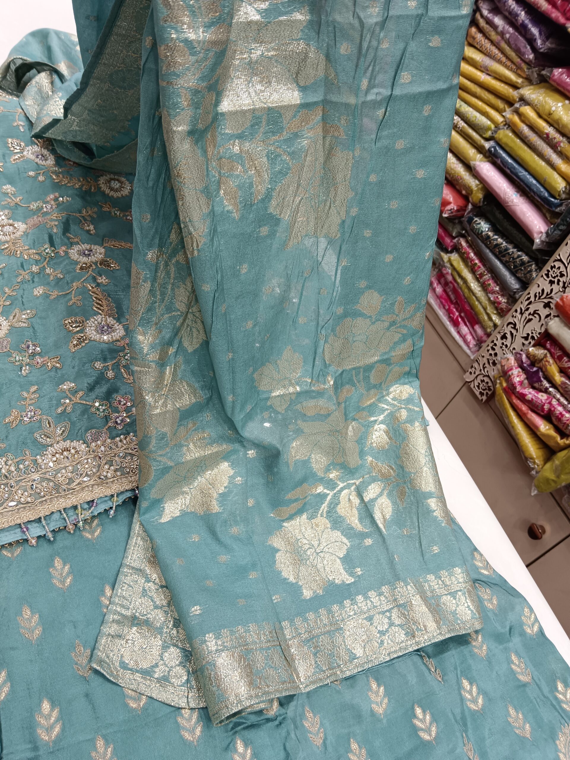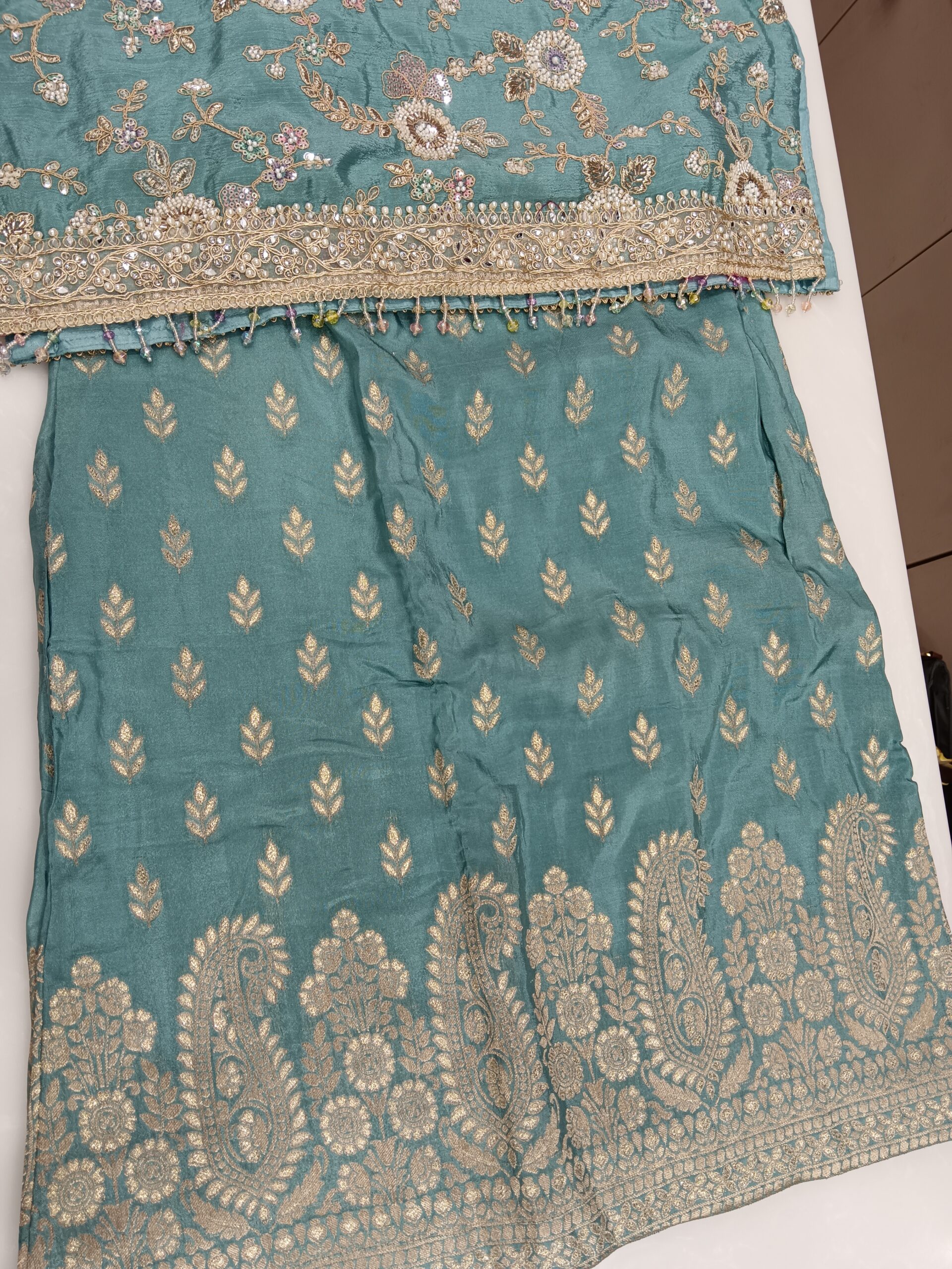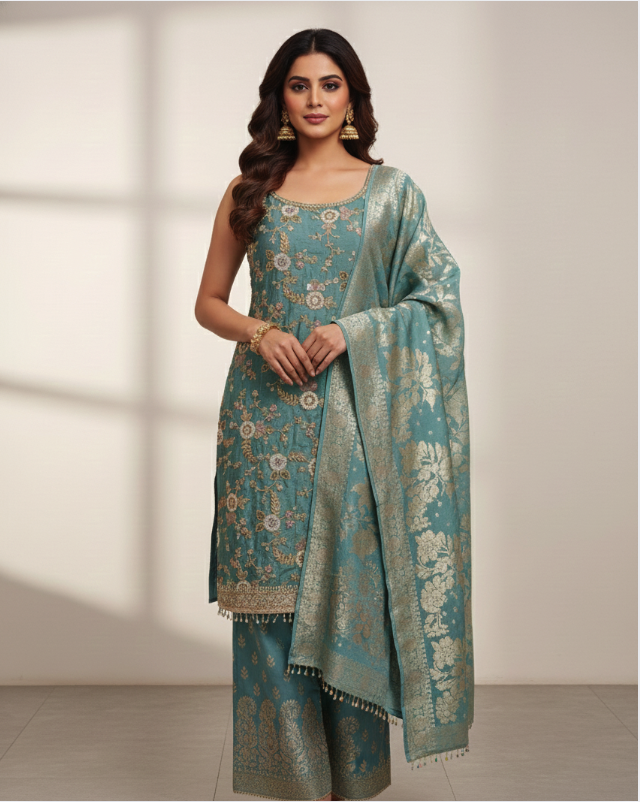 Completed with a rich banarasi dupatta, this ensemble is ideal for festive gatherings, weddings, family functions, and special occasions. A timeless outfit that blends cultural charm with contemporary trends, making it a must-have for your festive wardrobe.