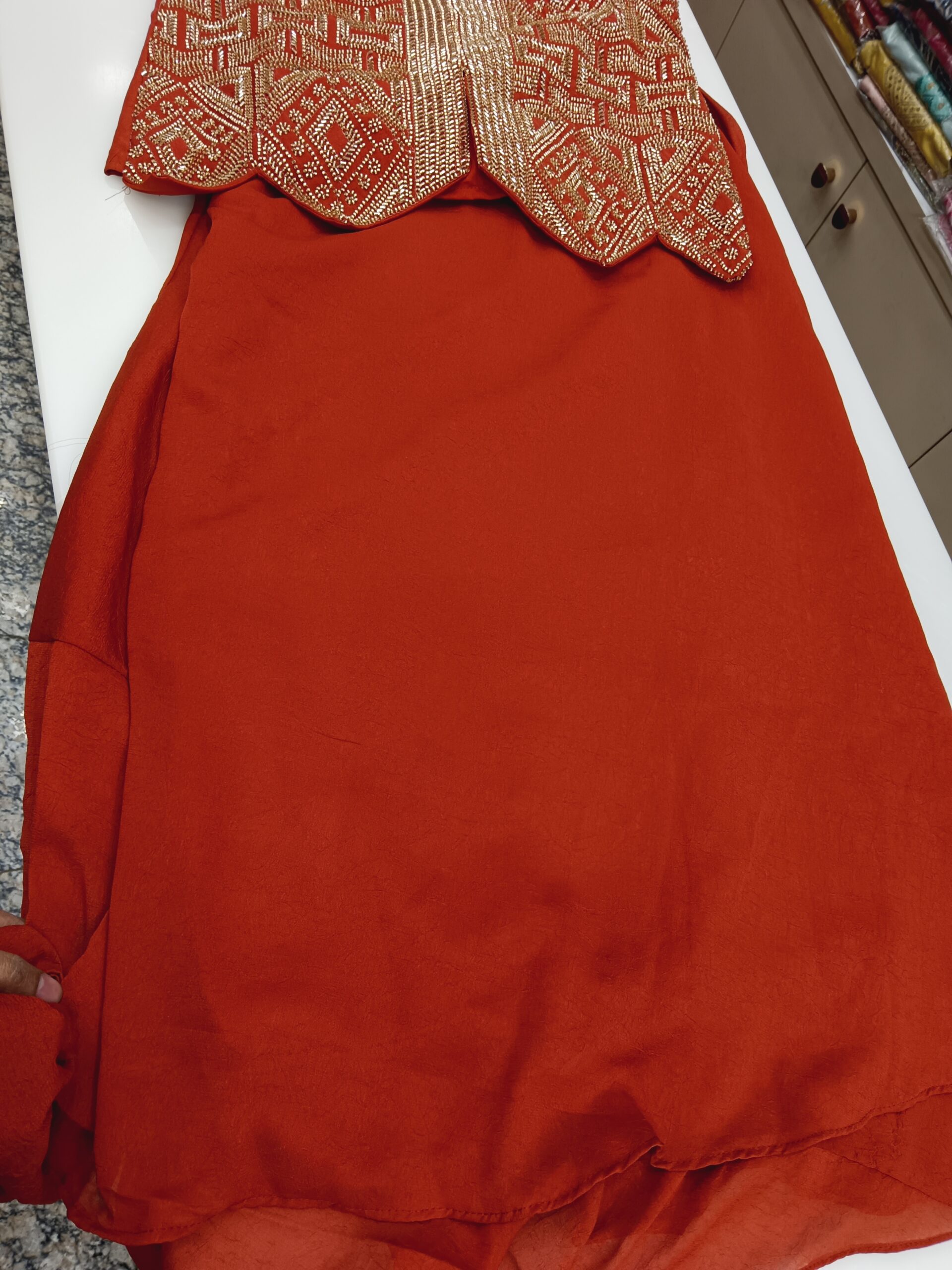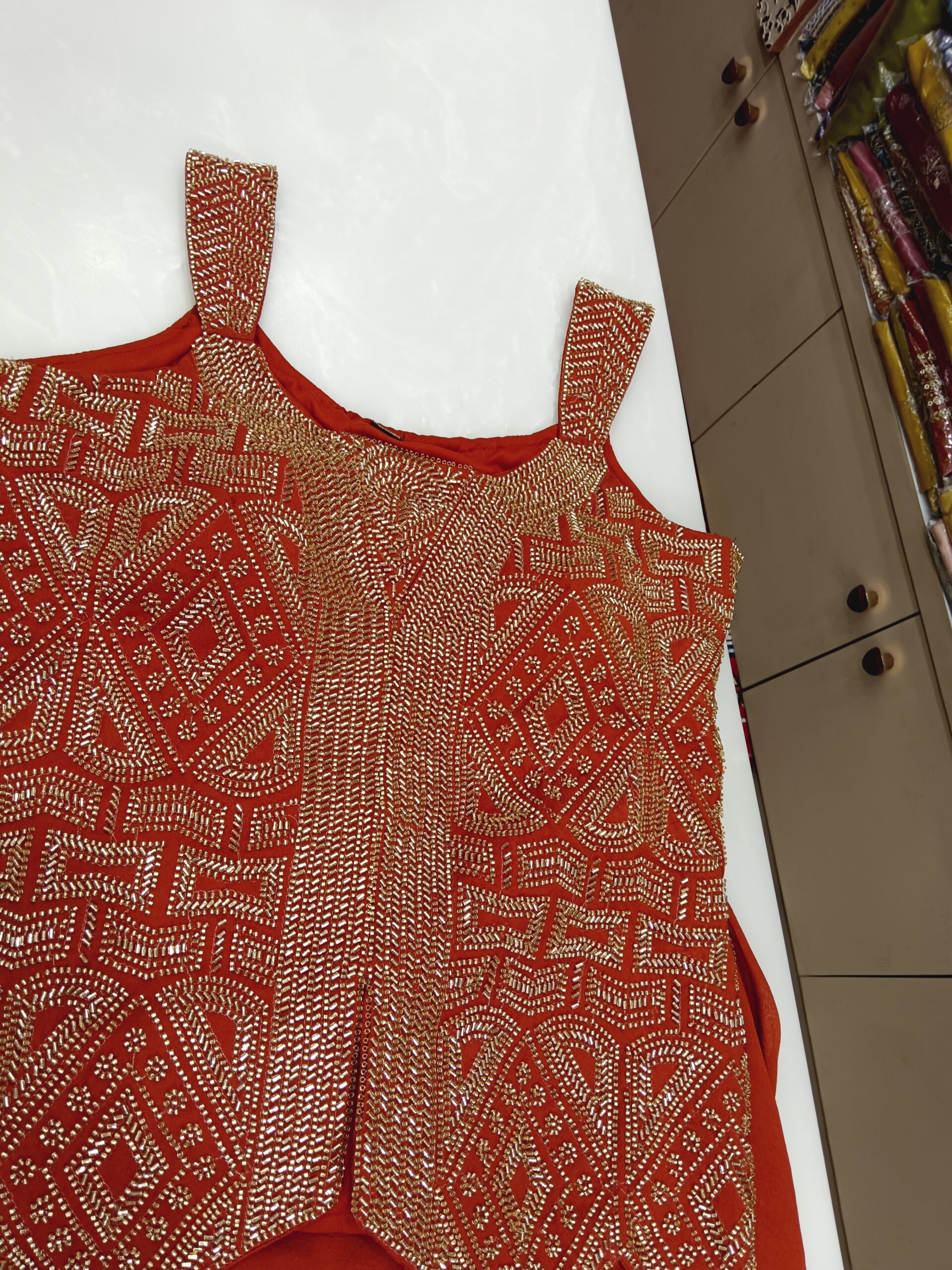 Paired with flowy crushed georgette bottoms and a unique necklace-style dupatta, this ensemble offers a fashion-forward silhouette that stands out effortlessly. Ideal for festive evenings, parties, wedding functions, and celebrations, this look blends comfort, glamour, and trend perfectly