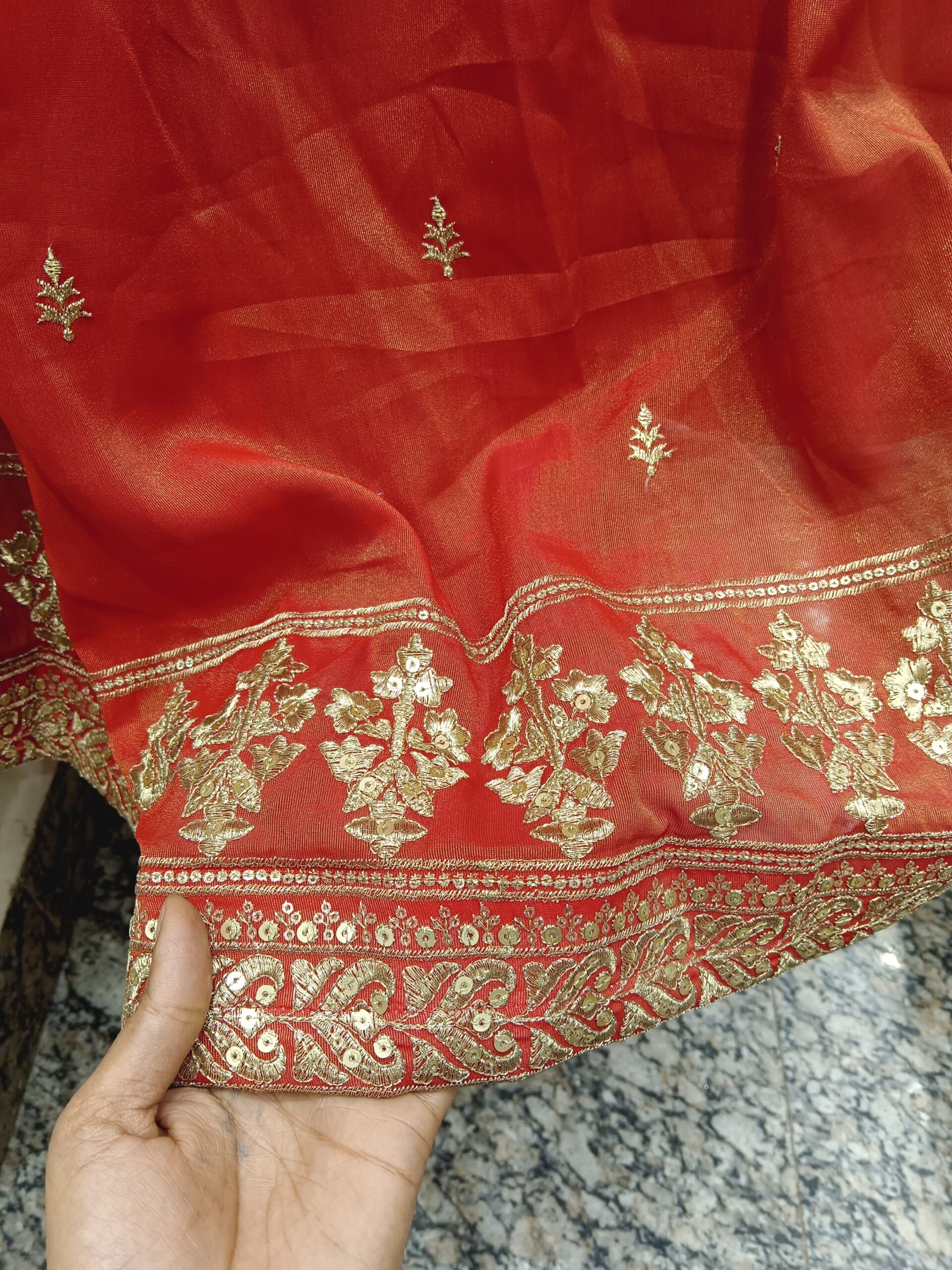 Red Glass Tissue Lehenga with Pure Golden WorkRed Glass Tissue Lehenga with Pure Golden Work