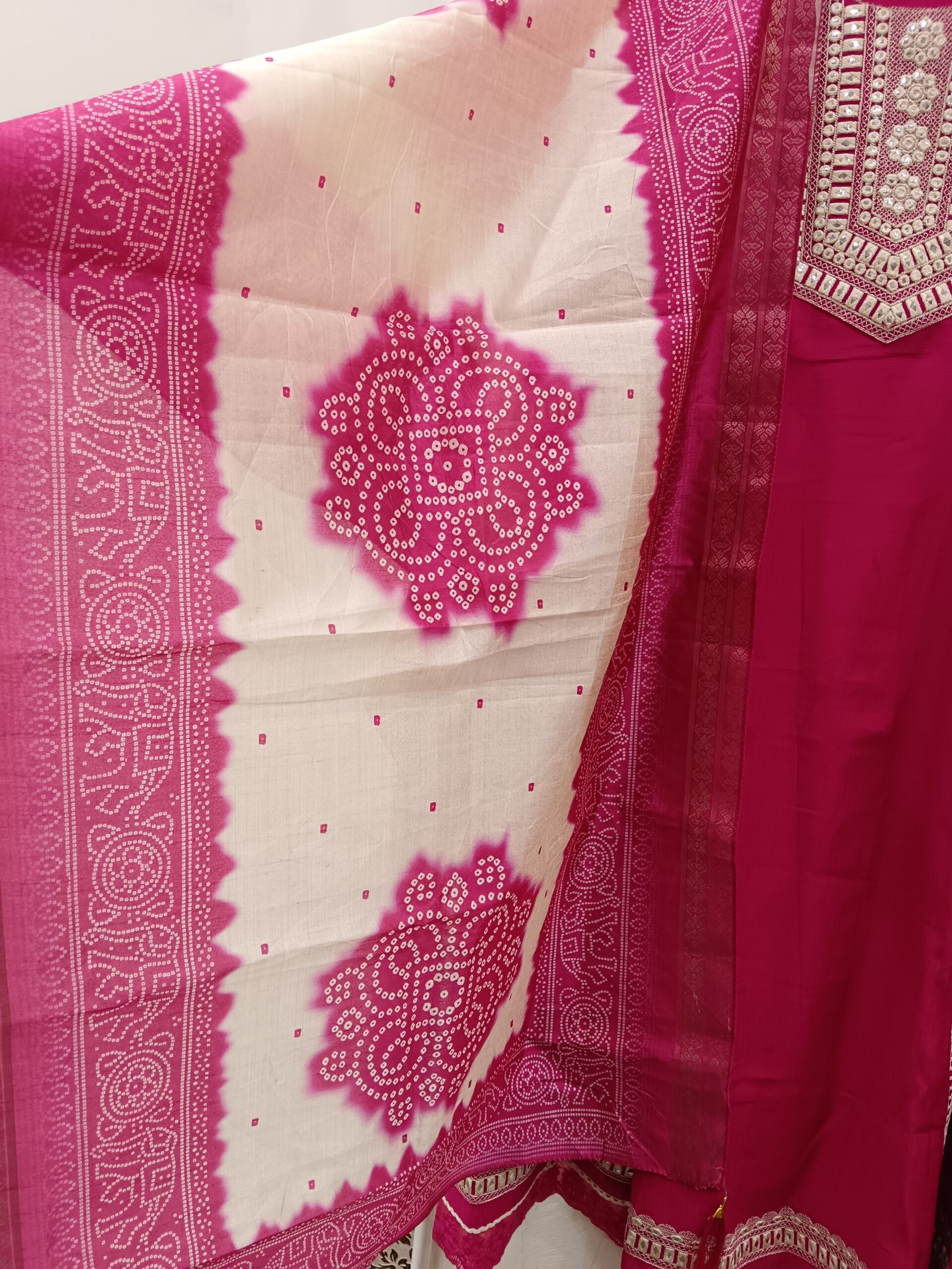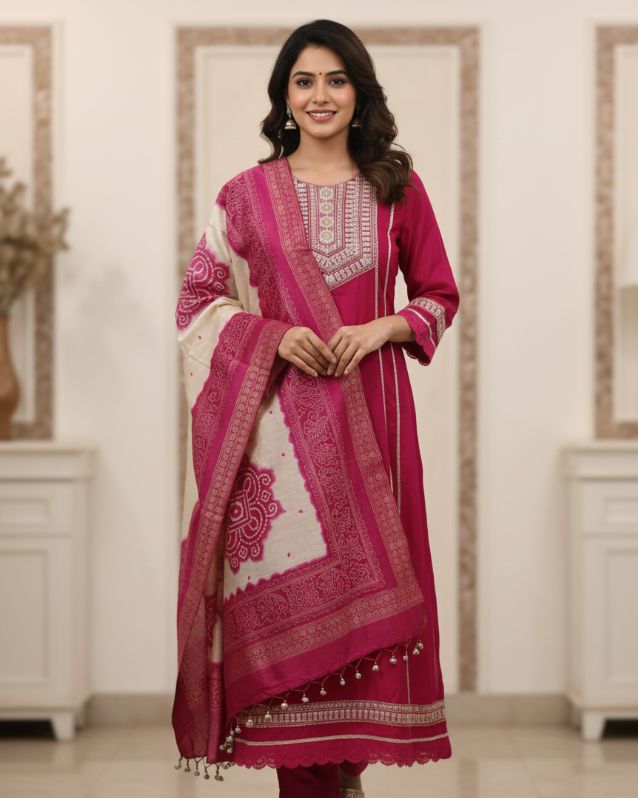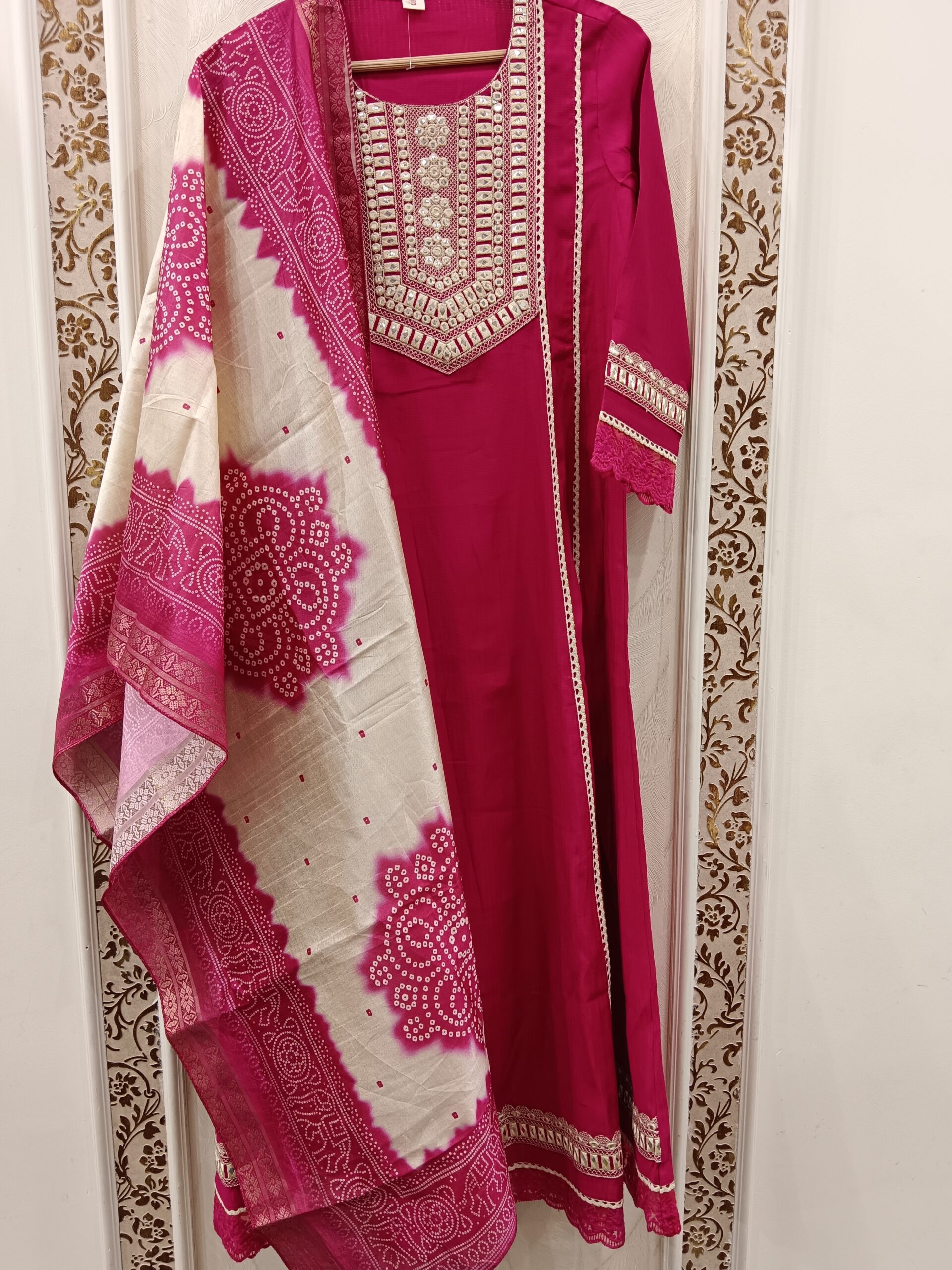 Silk A-Line Kurta Set with Bandhej DupattaSilk A-Line Kurta Set with Bandhej Dupatta