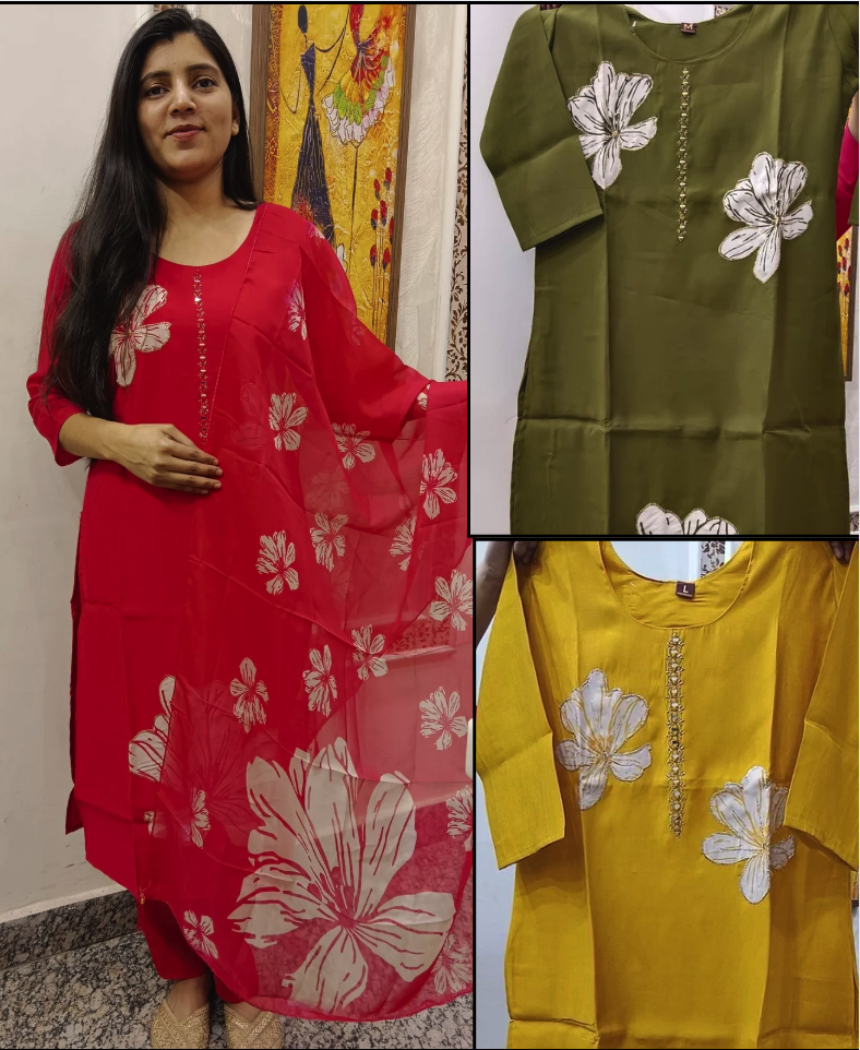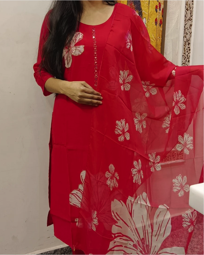 Paired with a beautifully crafted organza base digital print dupatta, this ensemble adds a touch of grace and modern charm. Lightweight and comfortable, it is ideal for festive celebrations, family functions, office gatherings, and special occasions. Available in three stunning colors, this suit set is a versatile addition to your ethnic wardrobe.